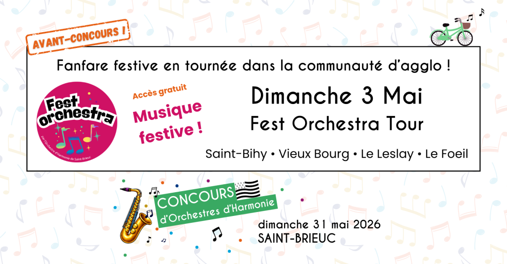 Retrouvez le Fest Orchestra, section de l’Orchestre d’Harmonie de Saint-Brieuc, pour une tournée intercommunale et festive dans les communes de St Bihy, Vieux Bourg, Le Foeil…